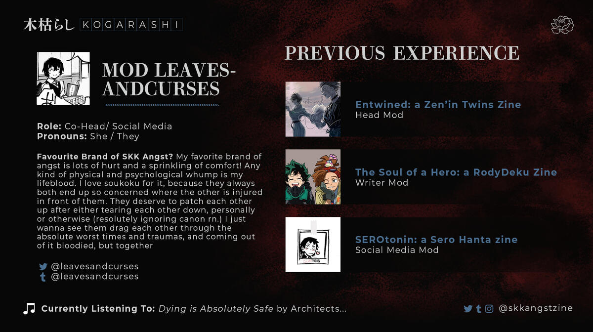 木枯らし ("Kogarashi"): the leaf-shaking, wilting winds that mark the end of autumn, indicative of the coming winter.Kogarashi is a for-profit, angst-themed zine focusing on Nakahara Chuuya and Dazai Osamu's partnership as 'Soukoku' over the years and universes.Following the conclusion of pre-order and leftover sales, Kogarashi: a Soukoku zine has now come to a close! Thank you to everyone who has supported this project over the course of its creation!