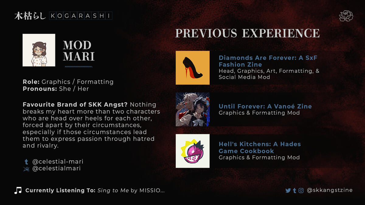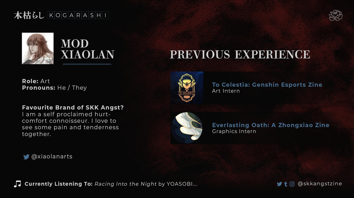 Currently, we require contributors to be 18+ to apply to Kogarashi due to the angst-oriented themes of the zine, canon material, and other potentially heavy topics which may be triggering to some readers.You must be 18 years old by September 21st, 2023 to be considered for a position in the project.Following the results of an interest check, a sexually explicit NSFW add-on can optionally be included in zine bundles.