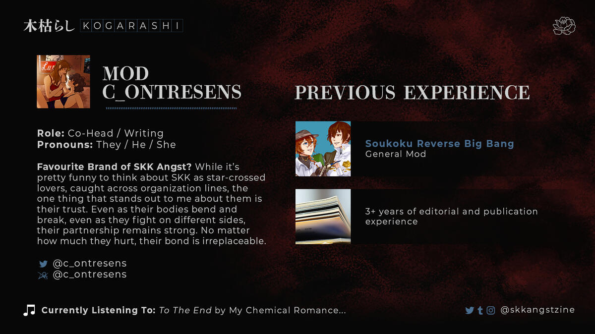 木枯らし ("Kogarashi"): the leaf-shaking, wilting winds that mark the end of autumn, indicative of the coming winter.Kogarashi is a for-profit, angst-themed zine focusing on Nakahara Chuuya and Dazai Osamu's partnership as 'Soukoku' over the years and universes.Following the conclusion of pre-order and leftover sales, Kogarashi: a Soukoku zine has now come to a close! Thank you to everyone who has supported this project over the course of its creation!